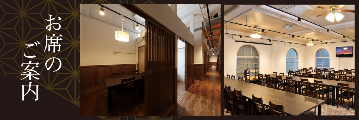 接待・会食、宴会、誕生日・記念日ディナー、デートの夜ご飯、法事、顔合わせ、還暦祝いや慶事の食事など多種多様なシーンにお応えできるお席をご用意しております。 周りの方を気にせずにゆっくりとお食事の時間をお楽しみいただけます。カウンター席での一人飲み、一階の個室を利用しての食事会、当店二階の大部屋は、最大140名でご利用いただけますので、大規模なご宴会もご相談ください。それぞれのお客様に合わせたお部屋をご用意させていただきます。下をクリックするとお席の詳細をご確認いただけます。